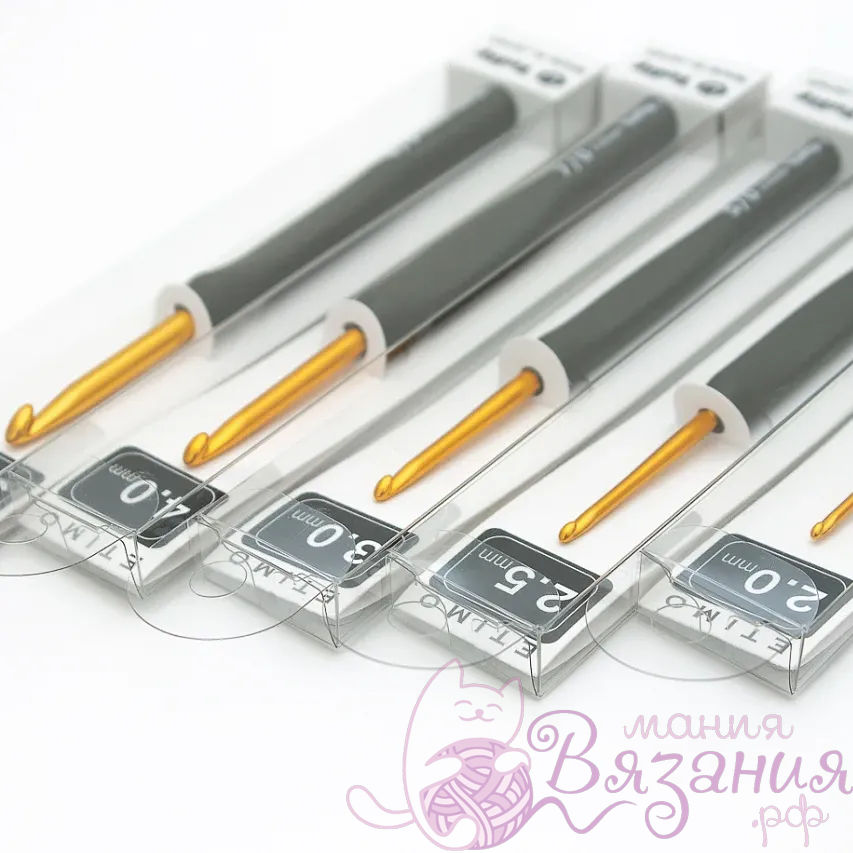 Крючки серии Etimo с удобной прорезиненной ручкой легкие и приятные в использовании. Естественно, ложатся в руку и обеспечивают гладкое вязание. Эргономичная ручка со специальным упором под большой палец позволяет длительное время работать без усталости в руках, подходит для любого варианта захвата. Специально обработанная головка крючка позволяет нити беспрепятственно скользить по инструменту. Крючки имеют черную ручку и золотистой наконечник, смотрятся очень стильно и лаконично. Вязать крючками серии Etimo настоящее удовольствие! Особенность производства мягкой ручки крючка не исключает потертостей и полос на поверхности ручки, которые легко удаляются полировкой в процессе использования крючка по назначению или с помощью мягкой влажной ткани.