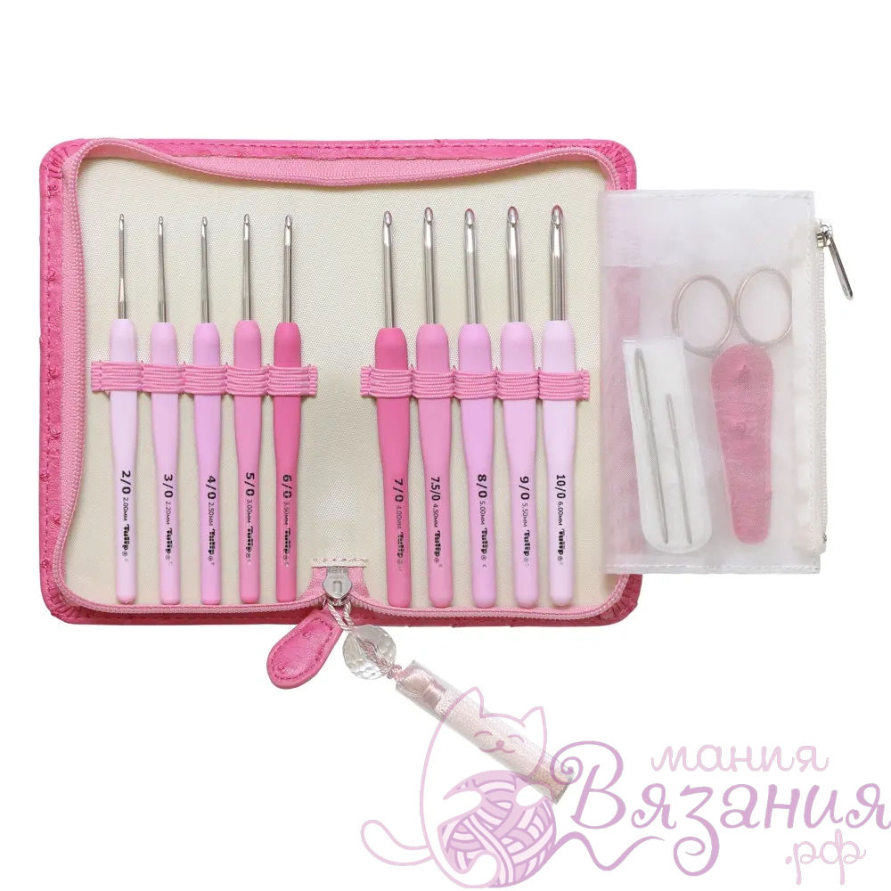 Tulip — это марка, которая заботится о своих покупателях и старается сделать вязание наиболее комфортным. Крючки являются визитной карточкой этой японской фабрики. Это изделия гарантированно высокого качества! Набор крючков для вязания Tulip Etimo Rose — это высокое качество и удобство. Мягкая ручка, изготовленная из специальной резины, сокращает нагрузку на пальцы. Форма ручки является наиболее удобной для комфортной работы, подходит для любого захвата. Специально обработанный наконечник крючка, позволяет скользить нити легко и свободно. Крючки выполнены в восхитительной розовой цветовой градации силиконовых ручек. Все инструменты хранятся в чехле с эффектом кожи страуса, который украшает шелковая кисть с большой хрустальной бусиной. В набор входит: — 10 крючков Etimo: 2.00, 2.20, 2.50, 3.00, 3.50, 4.00, 4.50, 5.00, 5.50, 6.00 мм; — итальянские ножницы с оригинальным покрытием цвета розового золота в безопасном футляре; — 2 трикотажные иглы (длиной 55 мм и 70 мм) — чехол из искусственной кожи с декоративной кисточкой. Особенность производства мягкой ручки крючка не исключает потертостей и полос на поверхности ручки, которые легко удаляются полировкой в процессе использования крючка по назначению или с помощью мягкой влажной ткани.